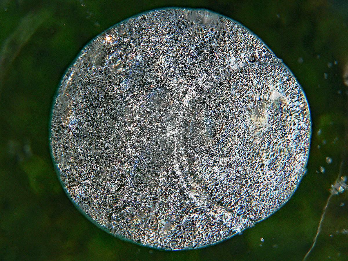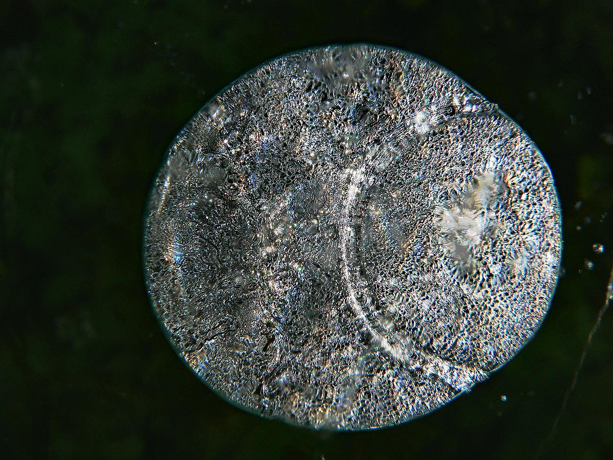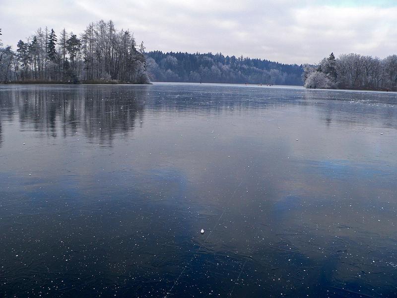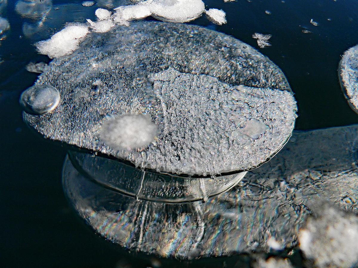 Gas bubbles in a frozen lake in close up.